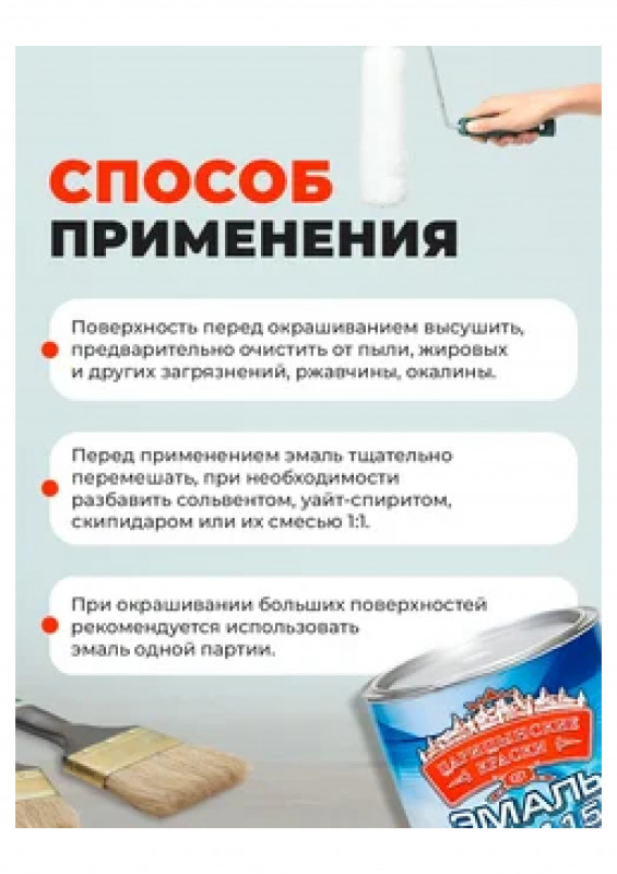 Способ применения: поверхность перед окрашиванием высушить, предварительно очистить от пыли, жировых и других загрязнений, ржавчины, окалины. Перед применением эмаль тщательно перемешать, при необходимости разбавить. При окрашивании больших поверхностей рекомендуется использовать эмаль одной партии.